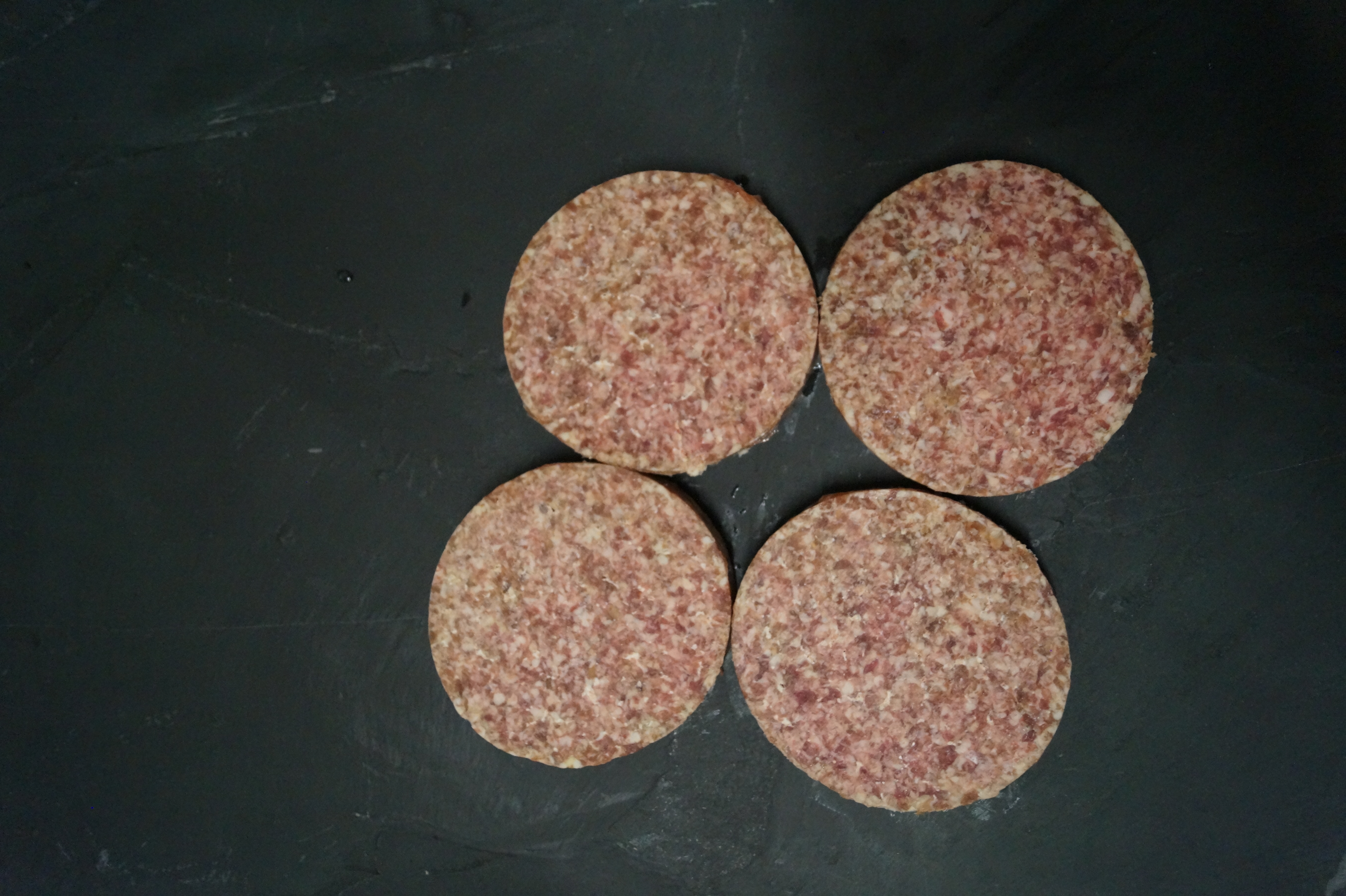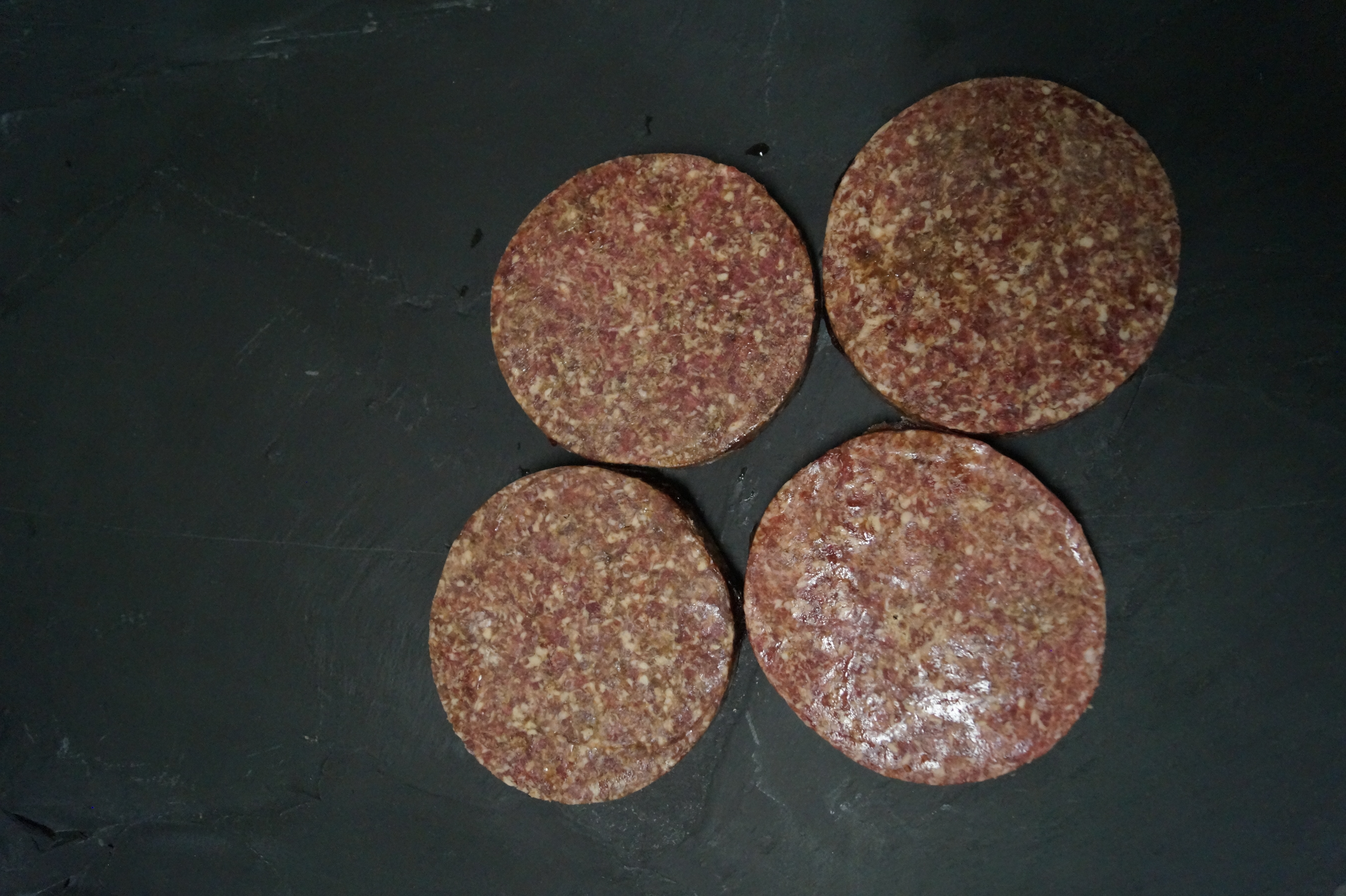 Nuestra hamburguesa mas económica. Consiste únicamente de tapas de cortes y piezas base para lograr aproximadamente 80% carne y 20% grasa.