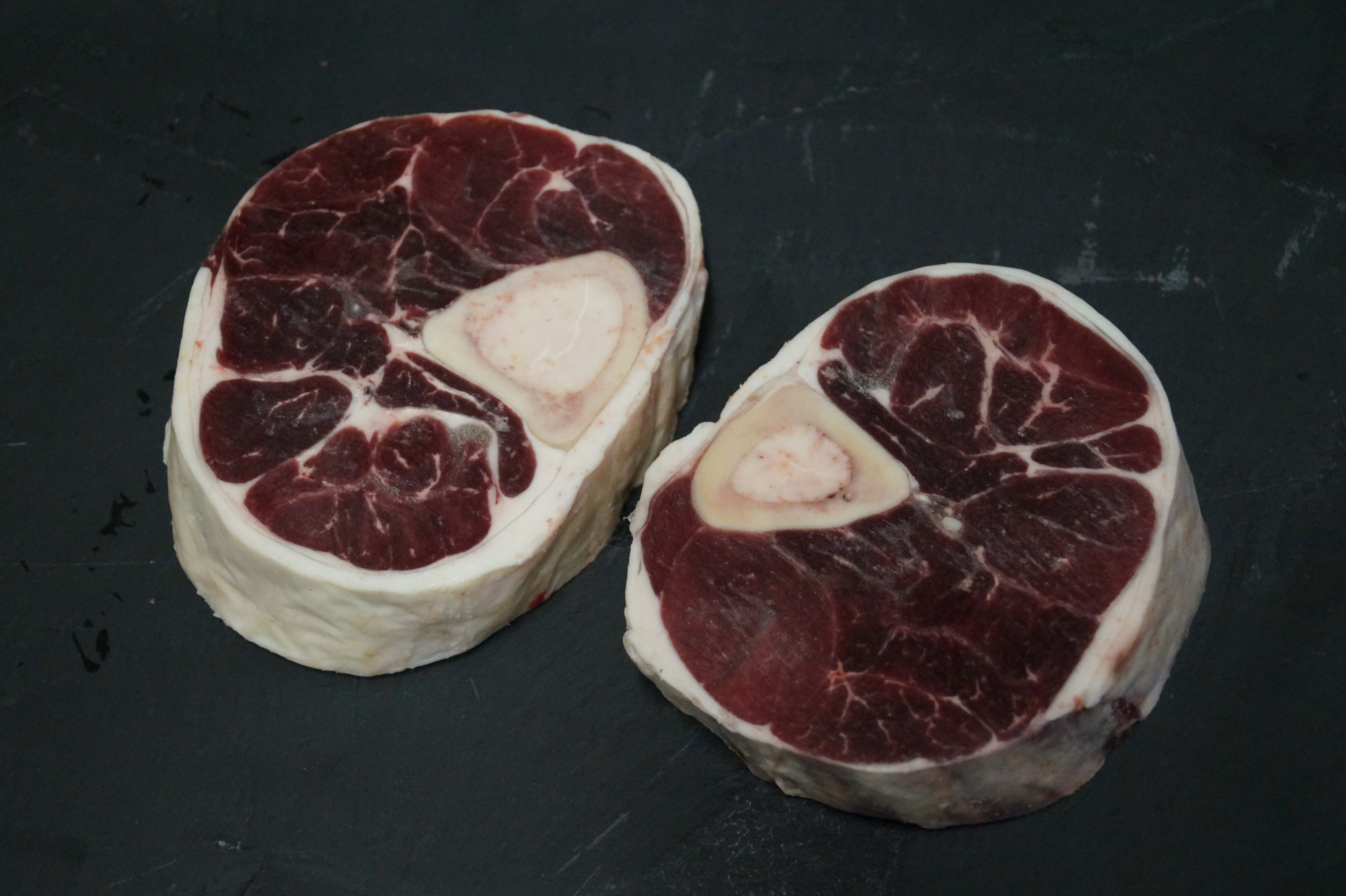 Chambarete trasero porcionado con un espesor de 2 1/2 pulgadas. Cuenta con tuétano, que es muy apreciado.